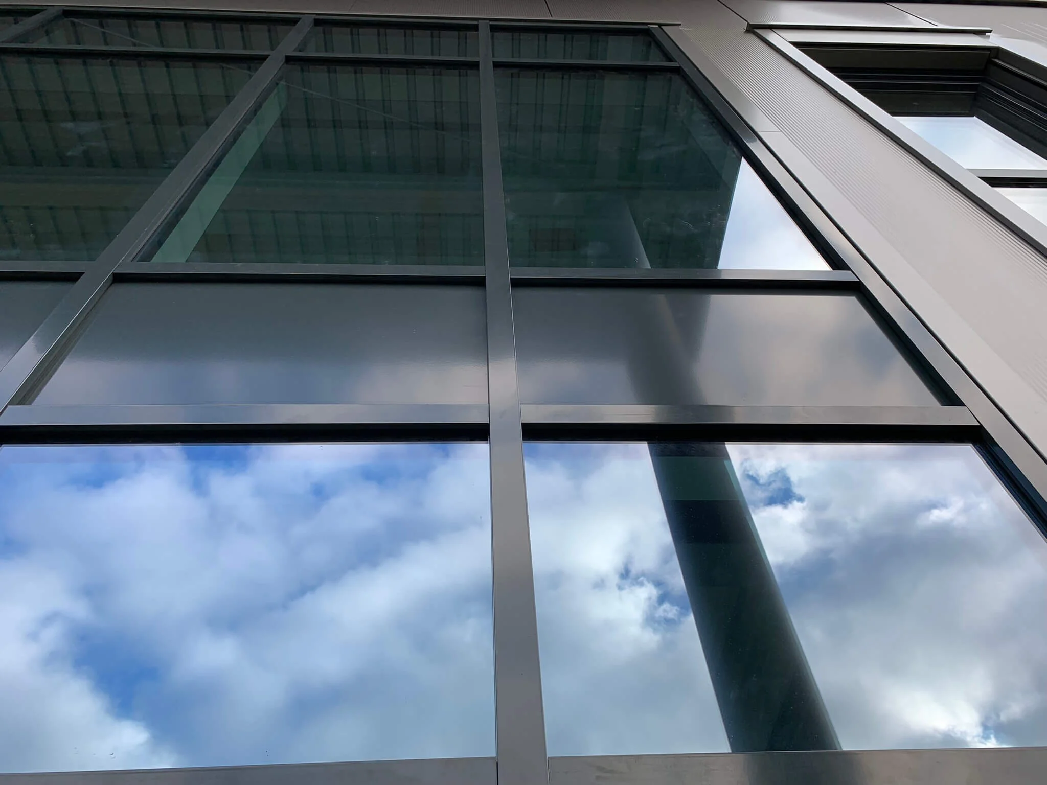 Lagerhalle mit Büroeinbau, einschiffig, freitragend, leichtgeneigtes Satteldach, Attika umlaufend, wärmegedämmtes Industriedach, Pfosten-Riegel Fassade, Zwischendecke, Zwischenwand, Sektionaltore, Türen, Fenster