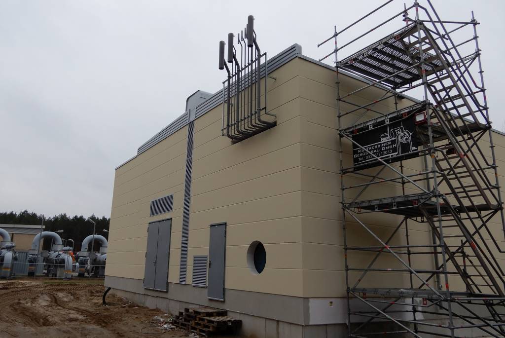 Neubau einer Halle, bestehend aus zwei Hallenteilen, leichtgeneigtes Pultdach, Stahltragwerk feuerverzinkt, wärmegedämmtes Industriedach als Attikadach, Fassade in Porenbeton-Wandplatten, Türen, Lüftungsgitter, Kranbahn, Kran.